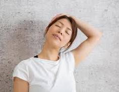- 右手を頭の左側に添え、息を吐きながら首を右肩へゆっくりと傾けます。