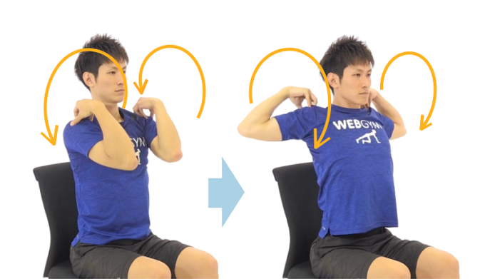 - 肘で大きな円を描くように、肩甲骨からゆっくりと大きく後ろに回します。(5回)